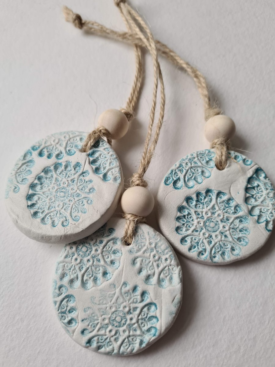 FREE DELIVERY 3 blue embossed circle clay hangi Folksy Very well made.