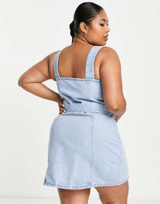 DTT Plus denim pinafore dress with tie waist in light blue Very well made.