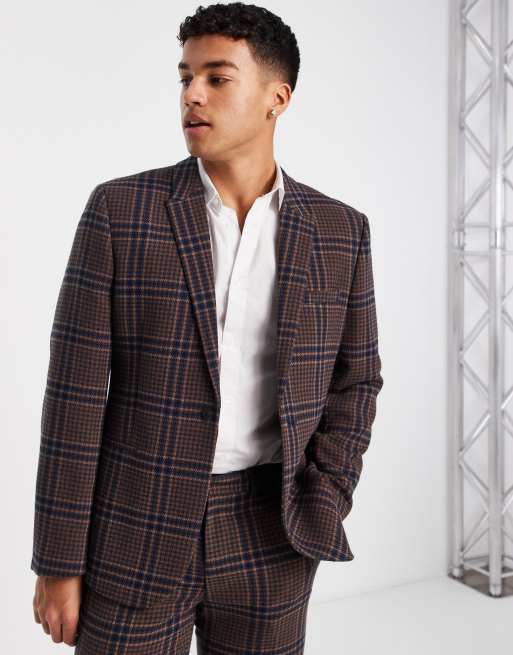 ASOS DESIGN slim wool mix suit jacket in brown and dark teal large dogtooth check Very well made.