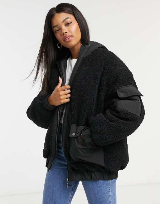 ASOS DESIGN fleece patched bomber jacket in black Very well made.