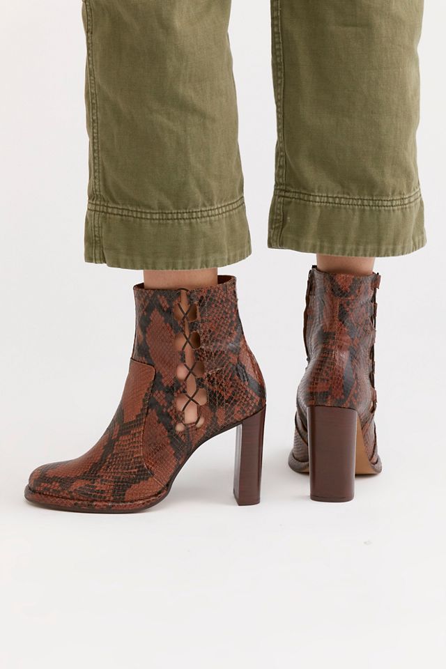 Free People Cecile Block Heel Ankle Boots Taupe Snake Animal Shoes Very well made.
