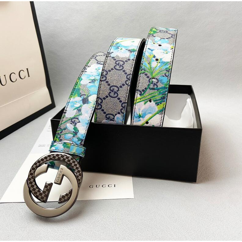 Gucci GG Supreme Blooms Belt with Brass Tiger Head Buckle in Blue Very well made.
