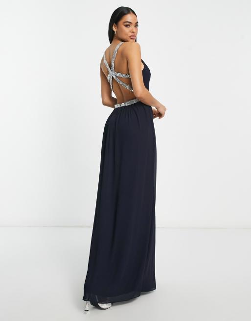 TFNC Bridesmaid maxi chiffon open back dress with embellishment in navy Very well made.