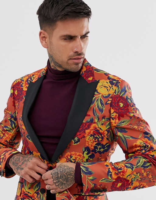 ASOS DESIGN skinny tuxedo blazer with floral jacquard in orange Very well made.