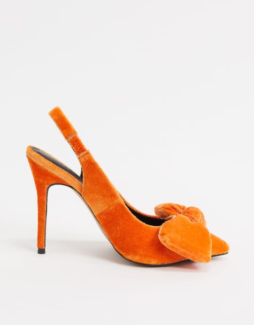 ASOS DESIGN Wide Fit Pheebs slingback stiletto heels with bow in orange velvet Very well made.