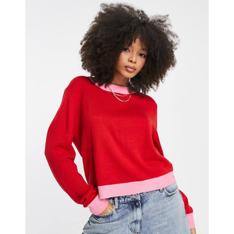 Pieces exclusive colourblock jumper in pink and red Very well made.