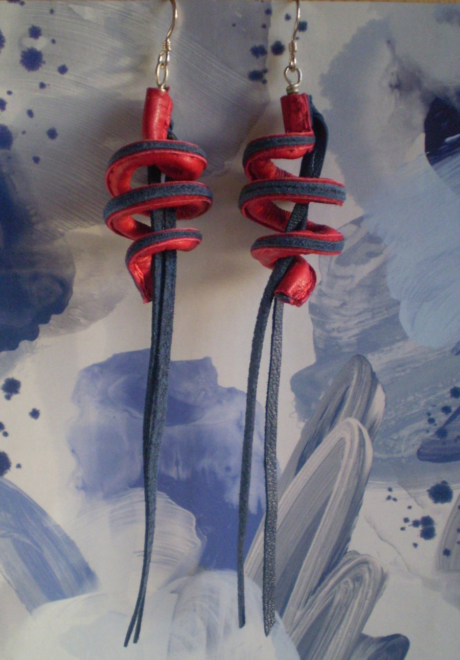 Tassel earrings in recycled Red and Blue upcycled leather Very well made.