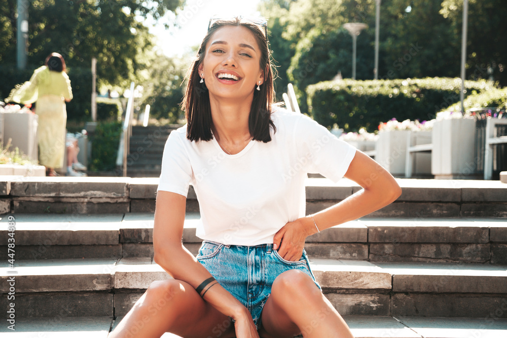 Portrait of young beautiful smiling hipster woman in trendy summer Very well made.