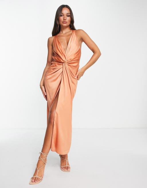 ASOS DESIGN Vestito lungo in raso color bronzo con nodo sul davanti e gonna drappeggiata Very well made.