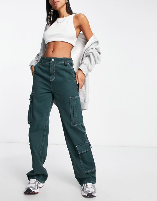 ASOS DESIGN multi pocket cargo jeans in green with contrast stitch Very well made.