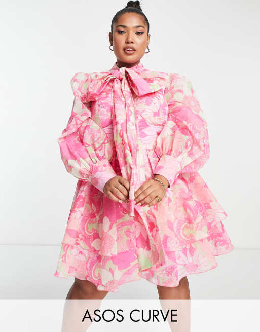 ASOS LUXE Curve chiffon mini swing dress with pussybow in pink Very well made.