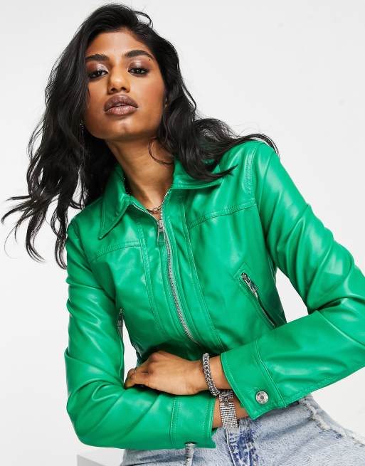 Bershka zip up collar detail faux leather jacket in bright green Very well made.