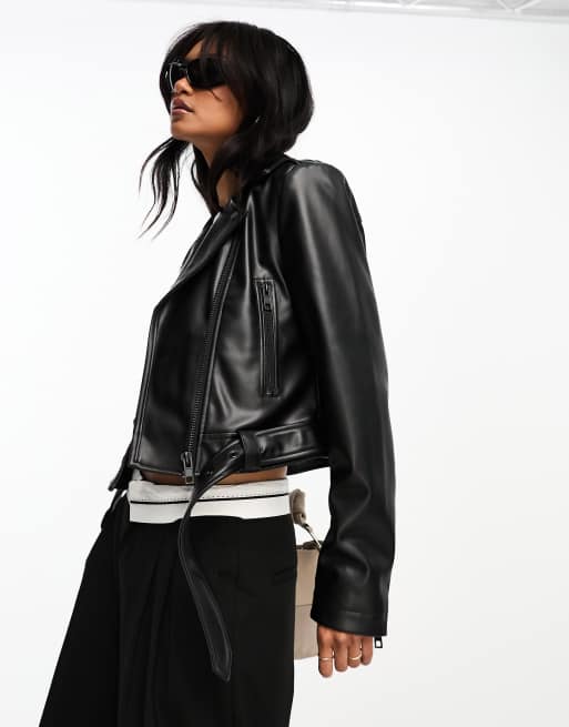 ASOS DESIGN faux leather shrunken biker jacket with belt in black Very well made.