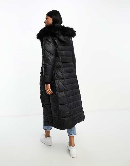 Womens Long Faux Fur Trim Hood Belted Quilted Jacket Puffer Coat Very well made.