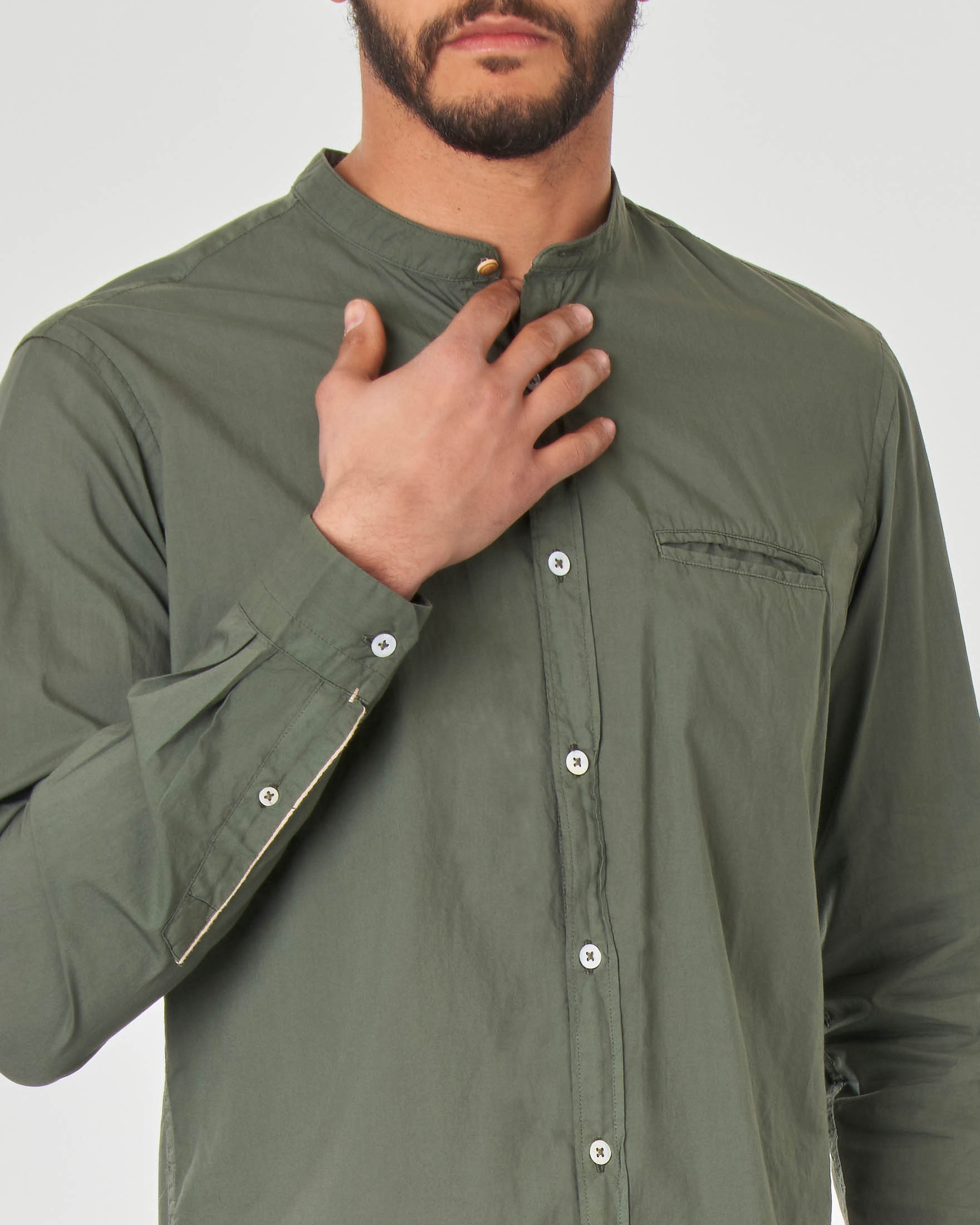 Camicia verde militare in mussola di cotone con collo a coreana e Very well made.